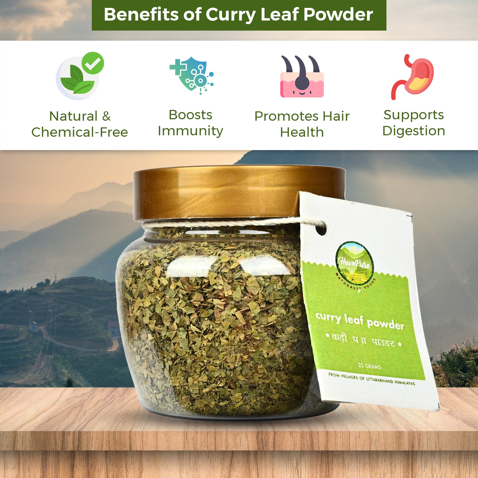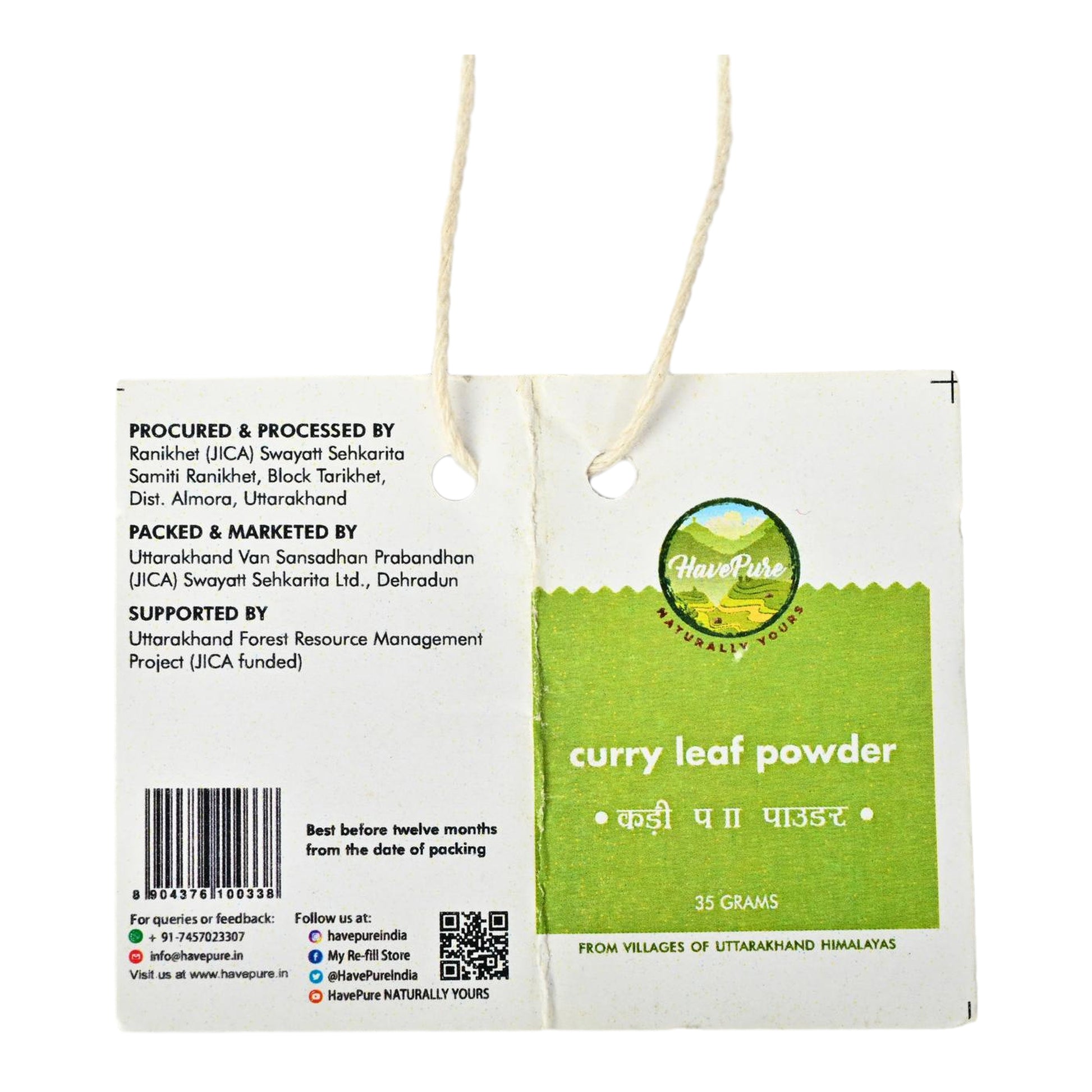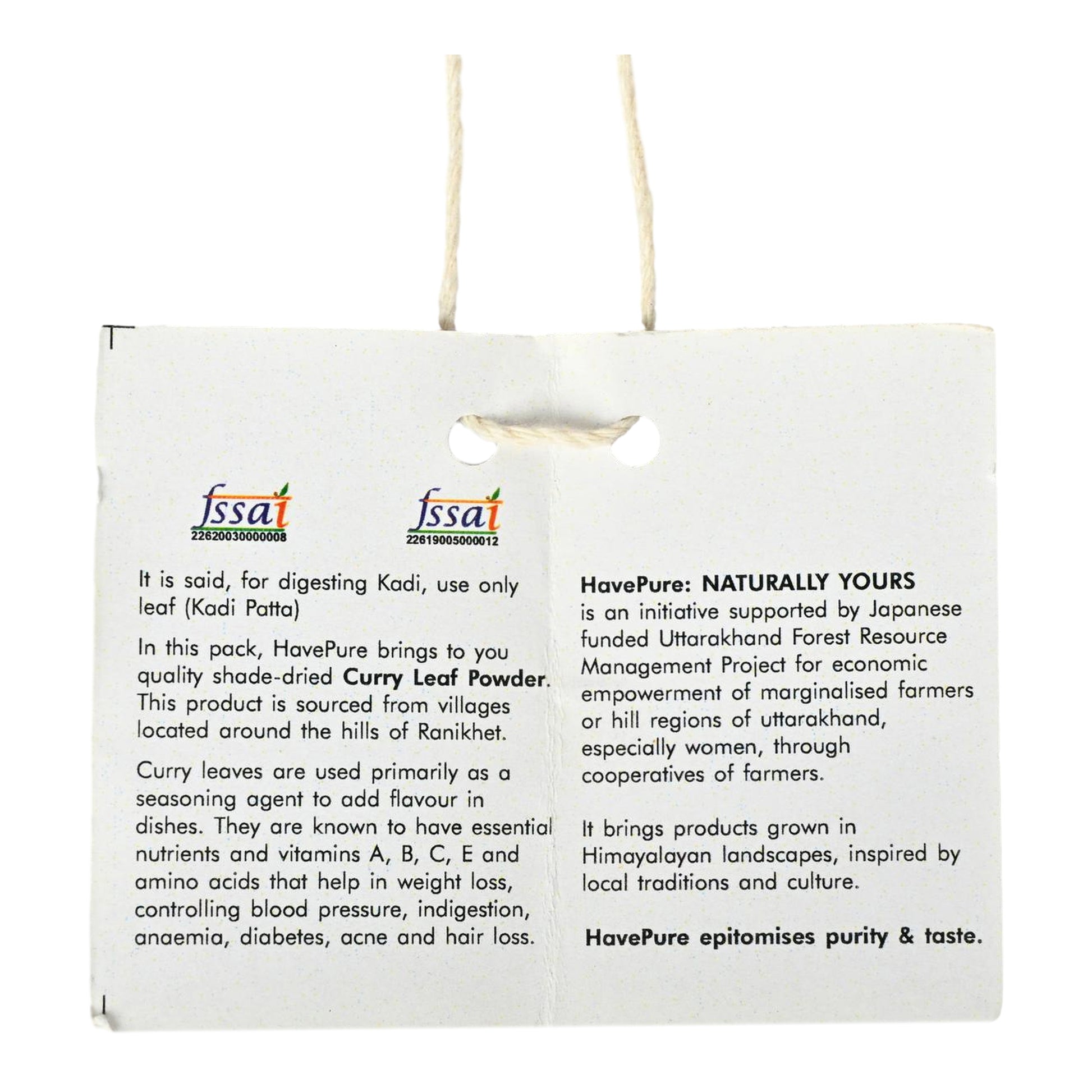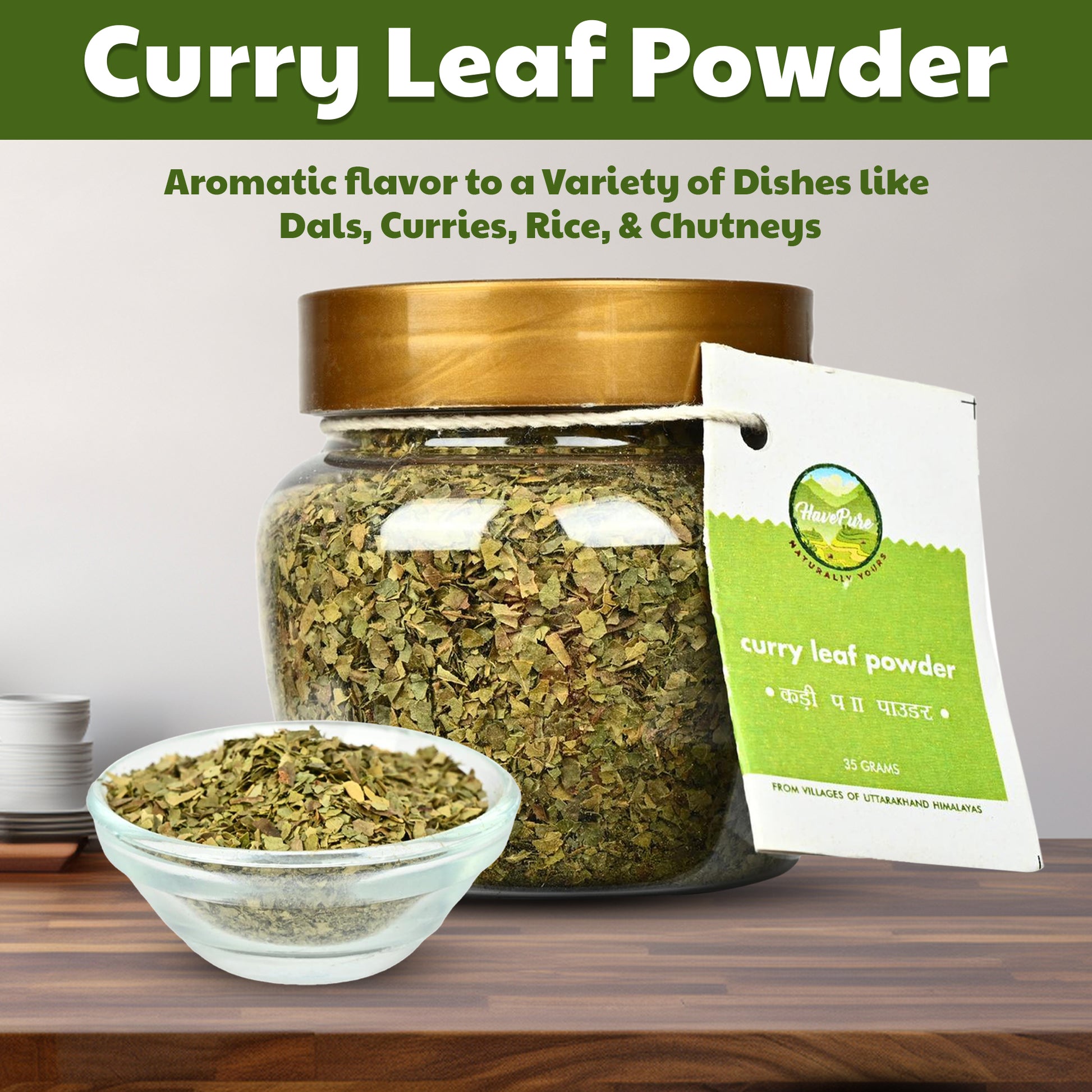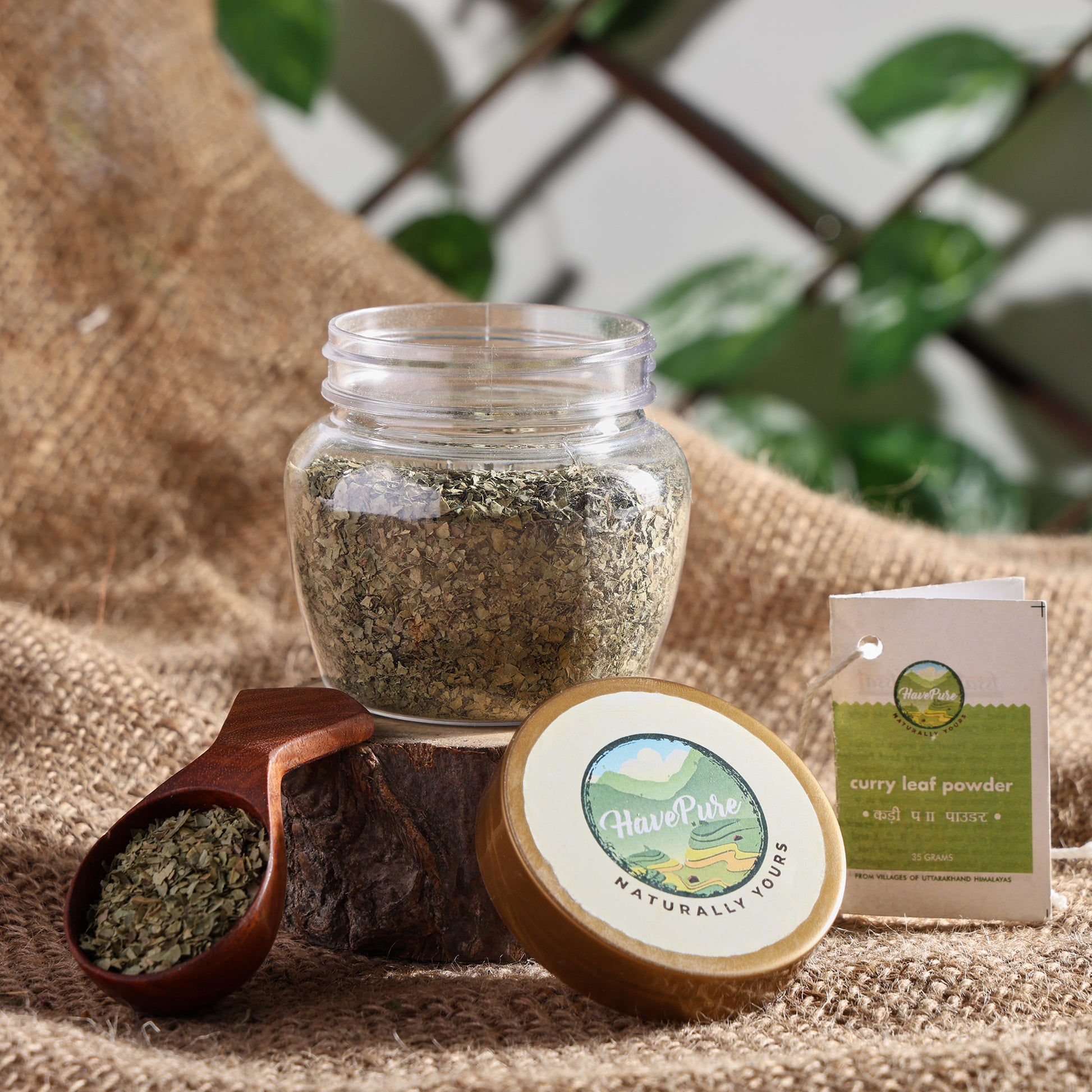 Bring home the authentic taste and health of the hills with HavePure Curry Leaf Powder, carefully shade-dried and finely ground to retain maximum flavor and nutrients.