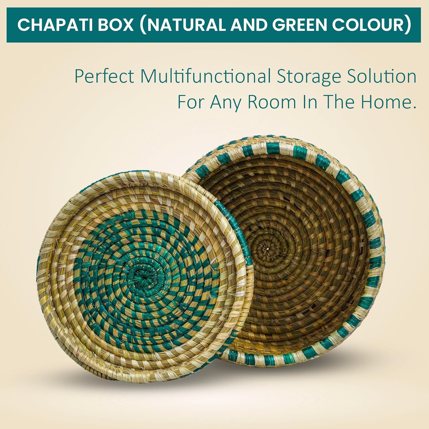 The Munj Grass Chapati Box is a beautifully handcrafted, eco-friendly storage solution designed to keep chapatis fresh and warm for an extended period. Made from natural Munj grass, this box embodies sustainability and traditional craftsmanship while adding an earthy charm to your kitchen. Its green and natural tones blend seamlessly with various home decors, making it both a practical and aesthetic choice. Munj grass is known for its breathable and insulating properties, which help maintain the softness and freshness of chapatis by allowing proper air circulation. Unlike synthetic materials, Munj grass absorbs excess moisture, preventing rotis from becoming soggy while keeping them warm and soft. This makes it an ideal choice for households that prefer chemical-free, natural, and biodegradable kitchenware. Each Munj Grass Chapati Box is carefully handwoven by skilled artisans, ensuring a strong yet lightweight structure. The craftsmanship involved in its making reflects generations of traditional weaving techniques. The tight, secure lid helps retain heat, ensuring that your chapatis stay fresh until they are ready to be served. Beyond functionality, this chapati box adds a rustic, eco-friendly charm to your dining experience. Whether used daily or on special occasions, its unique handmade design makes it a centerpiece of sustainable living. The natural green color enhances its appeal, making it a beautiful addition to any kitchen.