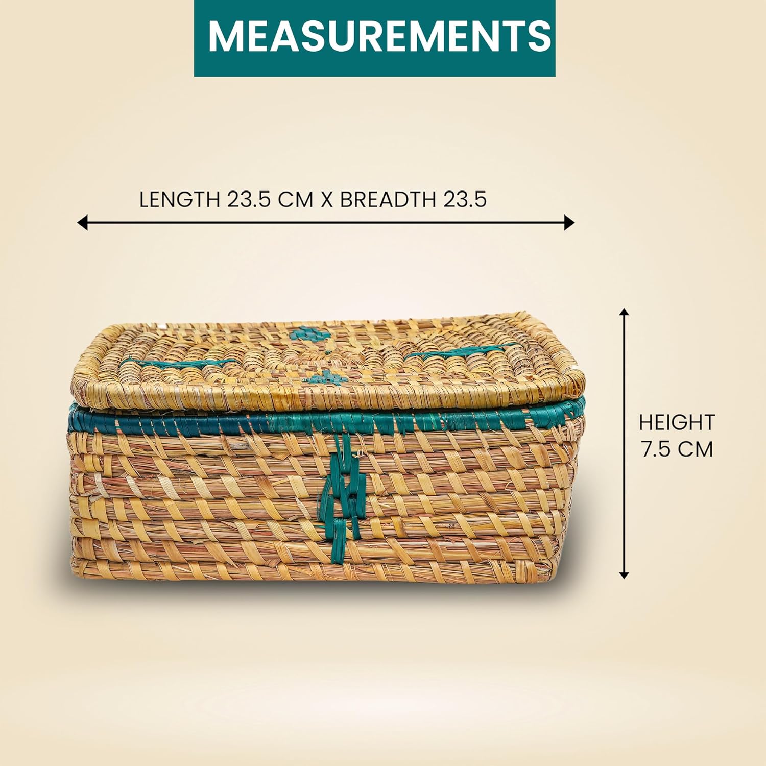 The Munj Grass Dry Fruit Box (Natural and Green Color) is a beautifully handcrafted and eco-friendly storage solution, designed to keep your dry fruits, nuts, and snacks fresh while adding a touch of traditional charm to your home. Made from 100% natural Munj grass, this intricately woven box is not only a functional storage accessory but also an artistic piece that reflects the beauty of sustainable craftsmanship. With its elegant combination of natural beige and green hues, this dry fruit box seamlessly blends with any décor, making it a perfect addition to your kitchen, dining table, or gifting collection. Sustainable and Eco-Friendly Choice Munj grass is known for its durability, strength, and biodegradable properties, making it a superior alternative to plastic or synthetic storage boxes. Unlike mass-produced containers that contribute to environmental waste, this handwoven dry fruit box is crafted from renewable materials, ensuring an eco-conscious lifestyle. By choosing this product, you are supporting sustainable practices and helping to preserve the art of traditional weaving, which has been passed down through generations. Elegant and Functional Design The Munj Grass Dry Fruit Box is designed not just for functionality but also for aesthetic appeal. The combination of natural beige and vibrant green colors gives it a refreshing and organic look, adding warmth and elegance to any setting. The smooth finish and intricate weaving pattern showcase the expertise of skilled artisans, making this box a unique and stylish storage option. Its compact yet spacious design makes it ideal for storing a variety of dry fruits such as almonds, cashews, walnuts, pistachios, raisins, and dates.
