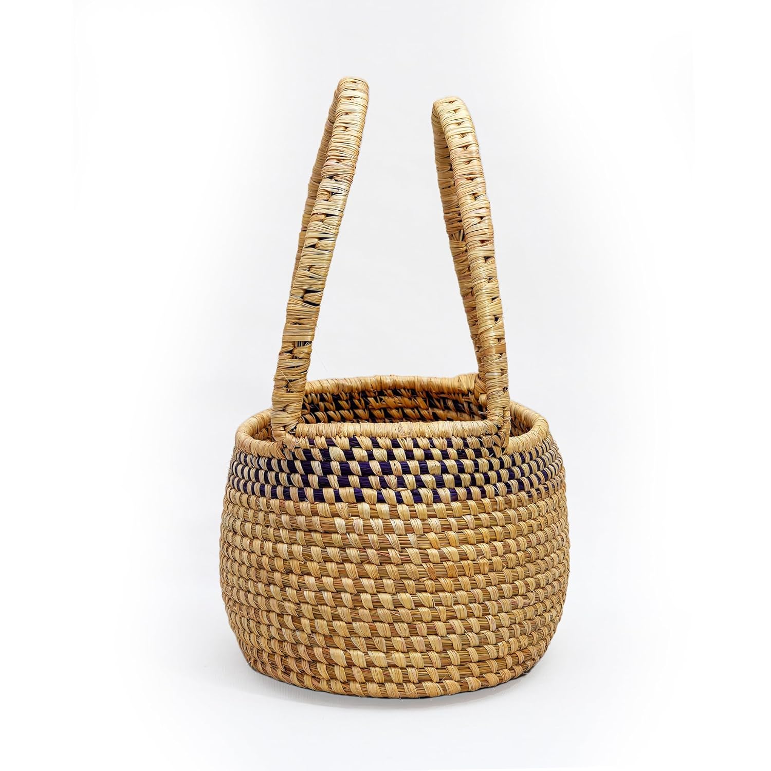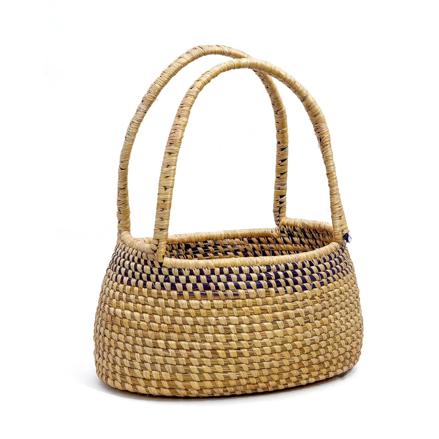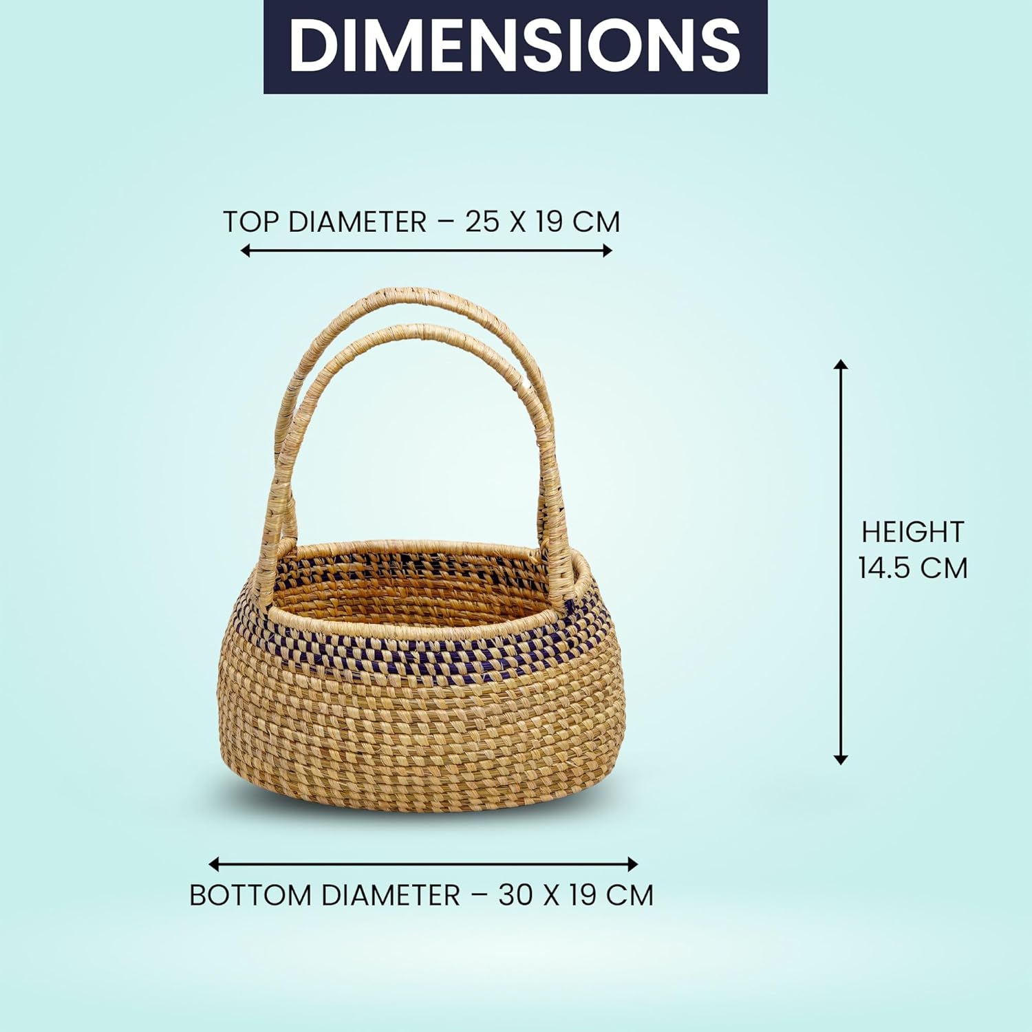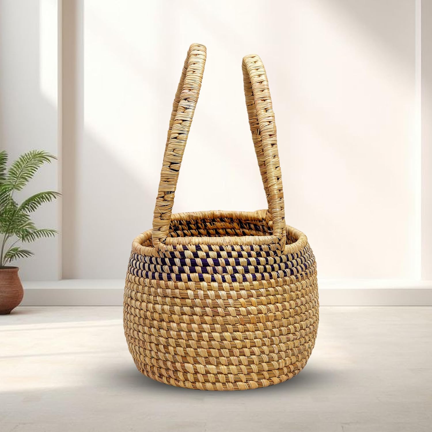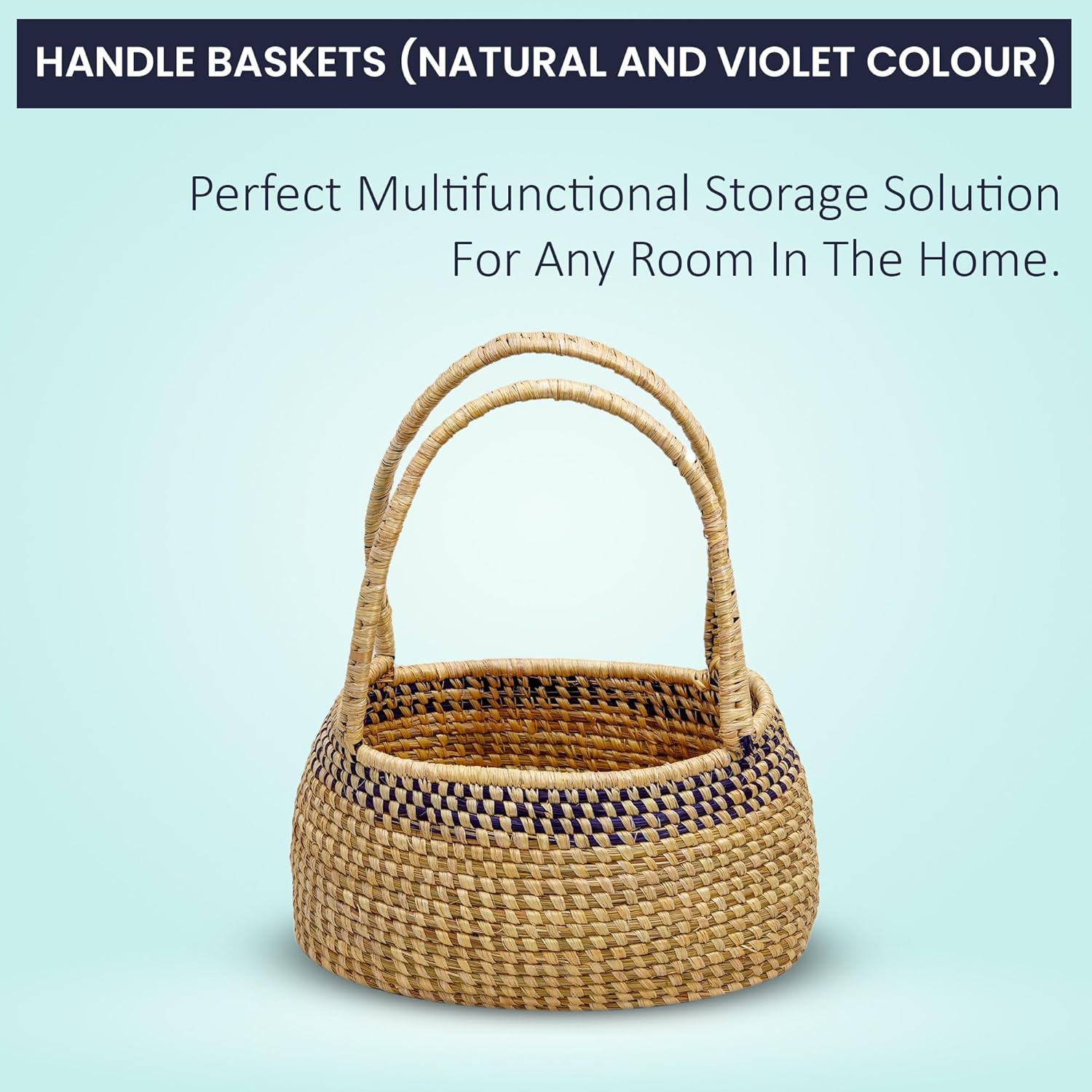 The Munj Grass Handle Basket is a beautifully handcrafted, eco-friendly storage and carrying solution designed to bring both functionality and aesthetic appeal to your home. Made from high-quality Munj grass, this basket is not only durable and lightweight but also biodegradable and sustainable. Its natural beige tones, combined with an elegant violet accent, make it a stylish yet practical addition to any household. Munj grass is widely known for its strength, flexibility, and breathable properties, making it an ideal material for woven baskets. Unlike plastic or synthetic alternatives, Munj grass is 100% natural, toxin-free, and environmentally friendly, ensuring safe usage for various purposes. Whether used for storing fruits, vegetables, laundry, picnic essentials, or as a decorative piece, this handcrafted basket blends seamlessly with both traditional and modern home decor. Each Munj Grass Handle Basket is meticulously woven by skilled artisans using age-old traditional techniques passed down through generations. The intricate weaving process ensures durability and sturdiness, allowing the basket to hold a variety of household items while maintaining its lightweight structure. The sturdy handle provides a comfortable grip, making it easy to carry even when loaded with heavier items. The violet color detailing adds a contemporary touch, enhancing the overall aesthetic appeal of the basket. Beyond its practicality, this basket is a symbol of sustainable living and cultural craftsmanship. Handwoven with care and precision, it supports local artisans and helps preserve the traditional craft of basket weaving. By choosing this eco-friendly alternative, you contribute to reducing plastic waste while embracing a more natural and responsible way of living.